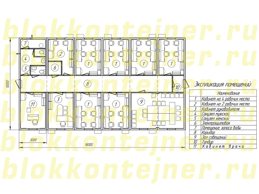 Модульное здание «Штаб строительства »   в 1-этаж, размер: (10,0 *19,6*3,0м) состоит из 16 единиц БК размер 4,0*2,4*2,5м: